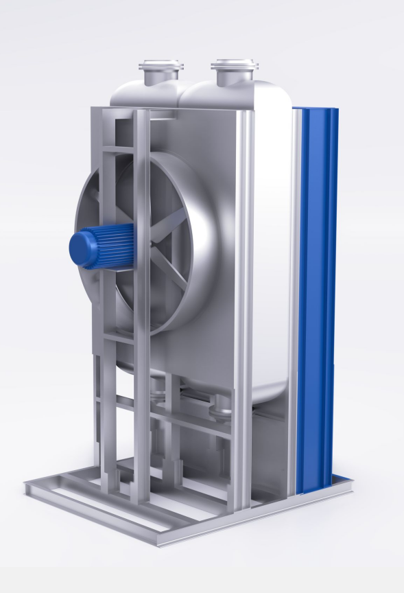 特點:傳熱單元為全焊式板束,風(fēng)機采用垂直安裝的引風(fēng)式風(fēng)機。整體采用分體式撬裝組合結(jié)構(gòu),運輸、檢修方便。采用特殊的板型作為傳熱元件,便于清洗吹灰。傳熱面積均為一次傳熱面積,與翅片管相比其傳熱性能具有長效性。板程流道截面大,特別適合于負壓操作系統(tǒng)等壓降要求嚴格的冷凝冷卻場合。